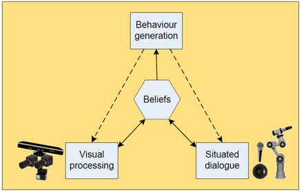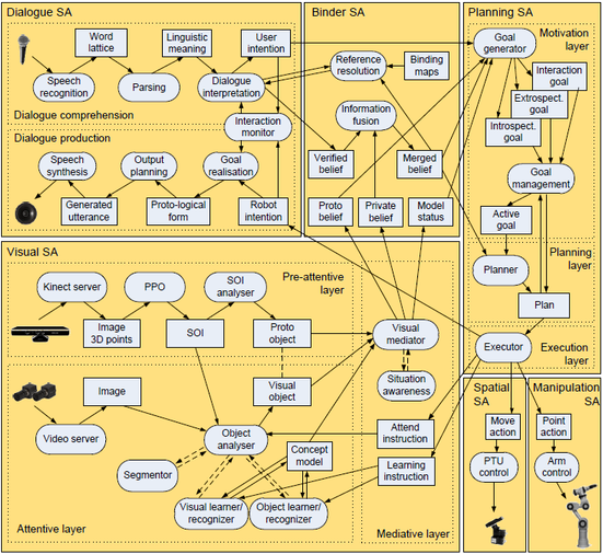 Our work focused on the integration of visual perception and processing of linguistic information by forming beliefs about the state of the world; these beliefs are then used in the learning process for updating the current representations. The system behaviour is driven by a motivation framework which facilitates different kinds of learning in a dialogue with a human teacher, including self-motivated learning, triggered by autonomous knowledge gap detection. George is based on a distributed asynchronous architecture depicted in the figure below.