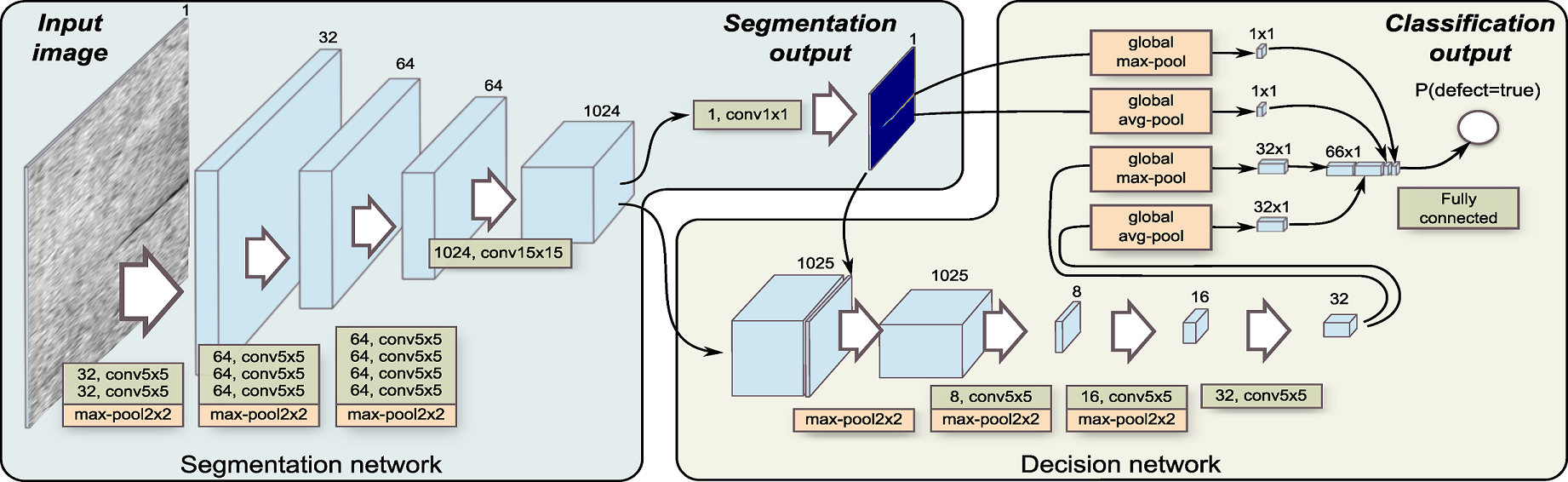 Our research explores a segmentation-based deep-learning architectures that are designed for the detection and segmentation of surface anomalies and is applied to a specific domain of surface-crack detection. We developed a novel two-stage network architecture. The first stage implements a segmentation network that performs a pixel-wise localization of the surface defect, while the second stage, where binary-image classification is performed, includes an additional network that is built on top of the segmentation network and uses both the segmentation output as well as features of the segmentation net.