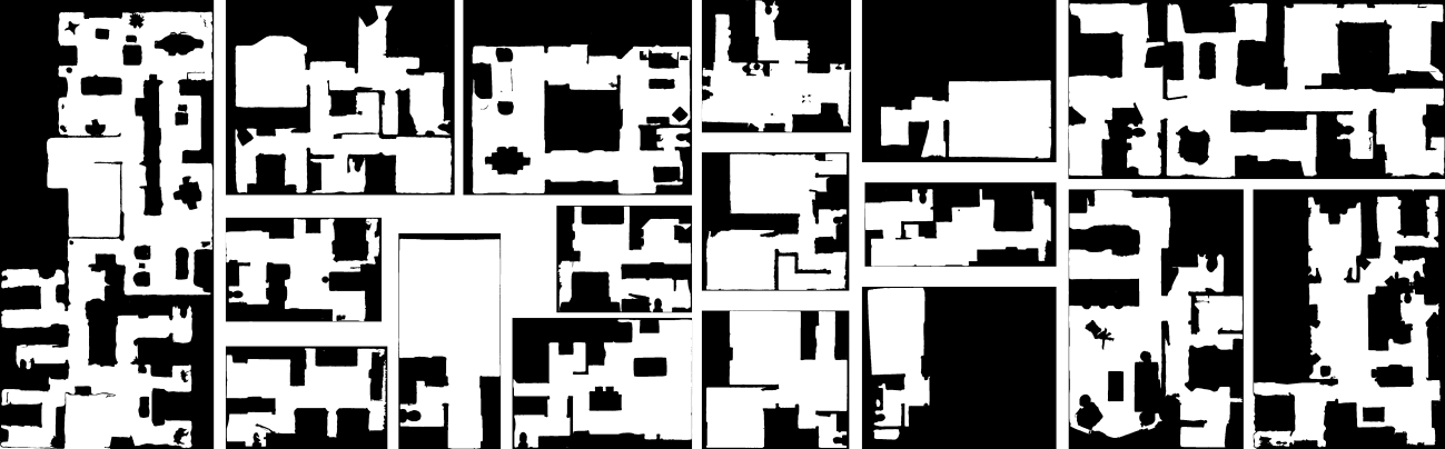 The dataset consists of 17 2D maps of indoor office and living environments generated from a subset of the Gibson Database, which contains 3D scans of real environments. The maps also have .yaml files for direct loading with the ROS package map_server. The dataset additionally contains start and goal coordinates for evaluating navigation tasks. Features of the dataset: