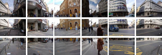 The Ljubljana urban image data set consists of 612 reference images of an urban environment covering an area of 200 x 200 meters (see the Google Earth overview map). At each of the 34 standpoints 18 images were captured at 6 orientations and 3 tilt angles covering a field of view of 360 x 100 degrees (see an example below). All images were taken with a Nikon D50 digital SLR camera with a field of view of 88 x 52 degrees at a resolution of 6 megapixel (3008 x 2000 pixels) in November 2005 in overcast weather. The positions of the reference standpoints were measured by classical surveying techniques using a theodolite for relative measurements (with an accuracy of 10 cm) and highly accurate GPS device for absolute positioning (accuracy 50 cm).